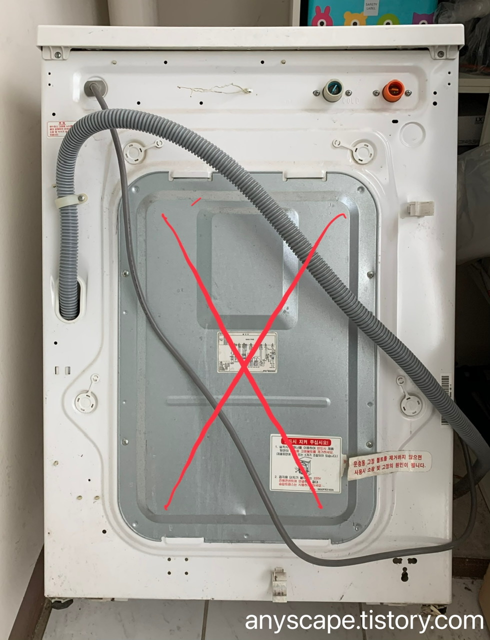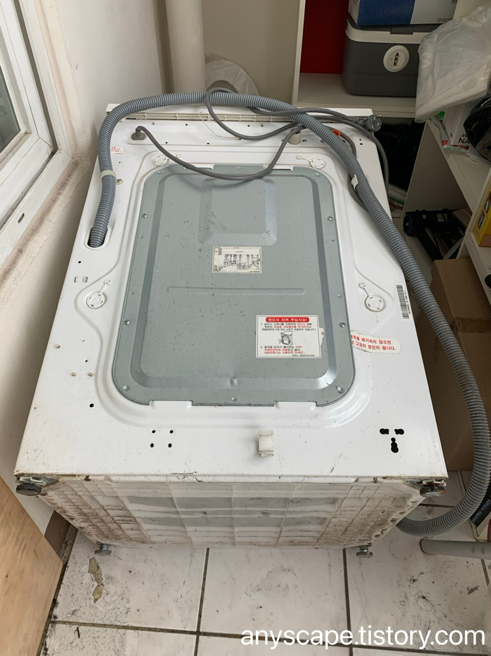 세탁기를 뒷면으로 돌려줍니다. 뒷면의 저 철판은 분해할 필요가 없습니다. 저는 모르고 분해를 했는데 전혀 그럴 필요가없더라구요.