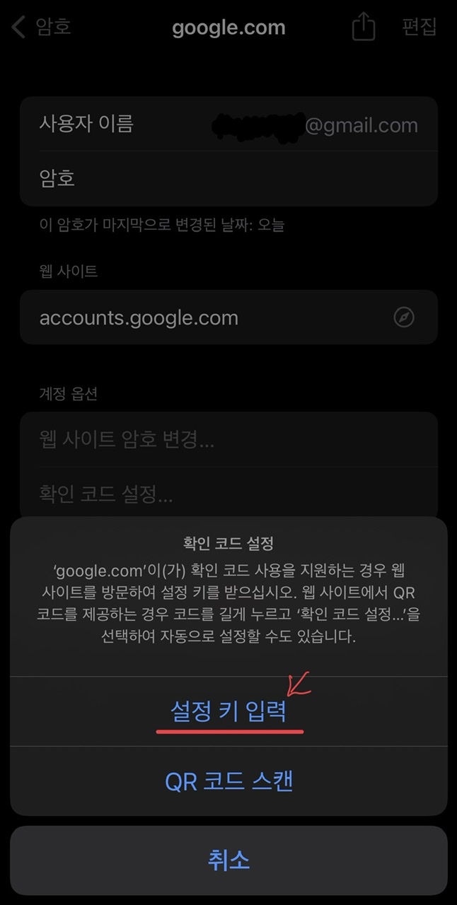 QR코드를 스캔해서 하는 방법도 있지만 여기서는 그냥 설정 키 방식으로 설명하겠습니다.