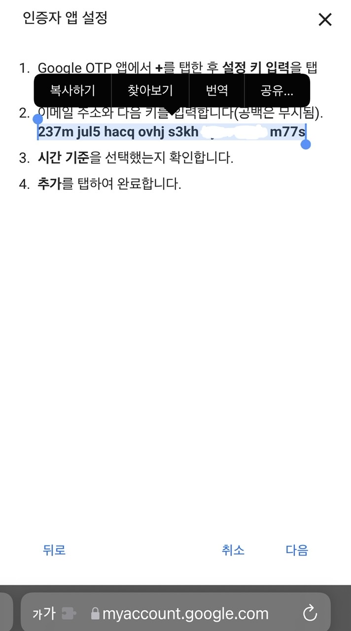 2. OTP앱을 실행시켜서 코드를 외우거나 복사해서,