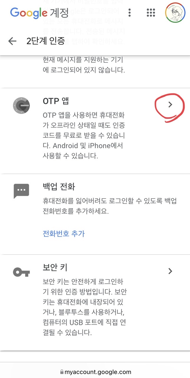 구글 id를 로그아웃한 다음에 다시 로그인을 합니다. 방금 2단계 인증을 설정했기 때문에 인증하라는 화면이 나옵니다. OTP앱에서 인증 코드 받기를 누릅니다.