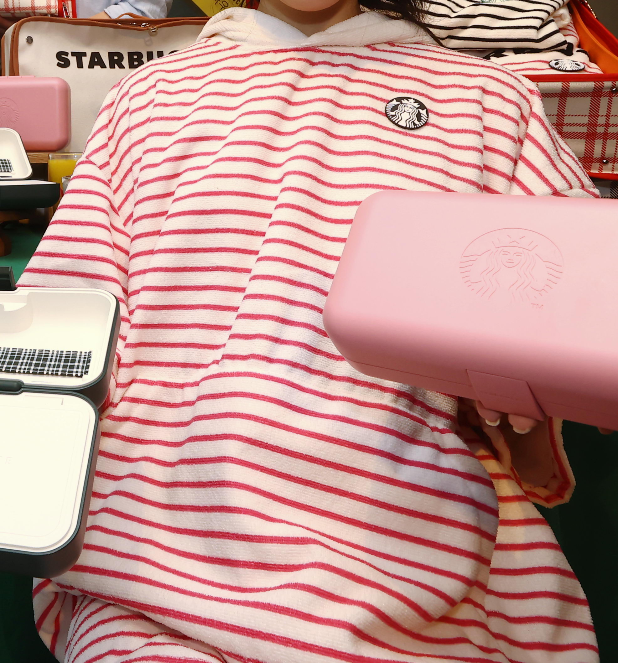 색은 핑크, 블랙 줄무늬 2가지 입니다. 프리사이즈입니다. 후드에 부착된 스타벅스 로고는 탈착 가능하다고 합니다.