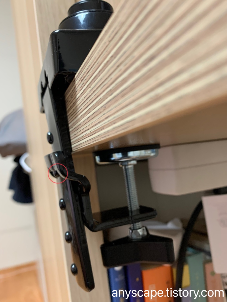 어느날 잠시 화장실 다녀왔더니 그 사이에 모니터가 이렇게 고꾸라져 있더군요. 장력 조절 나사를 너무 느슨하게 해놔서 그렇습니다. 적절하게 조으면 흘러내리지 않아요.