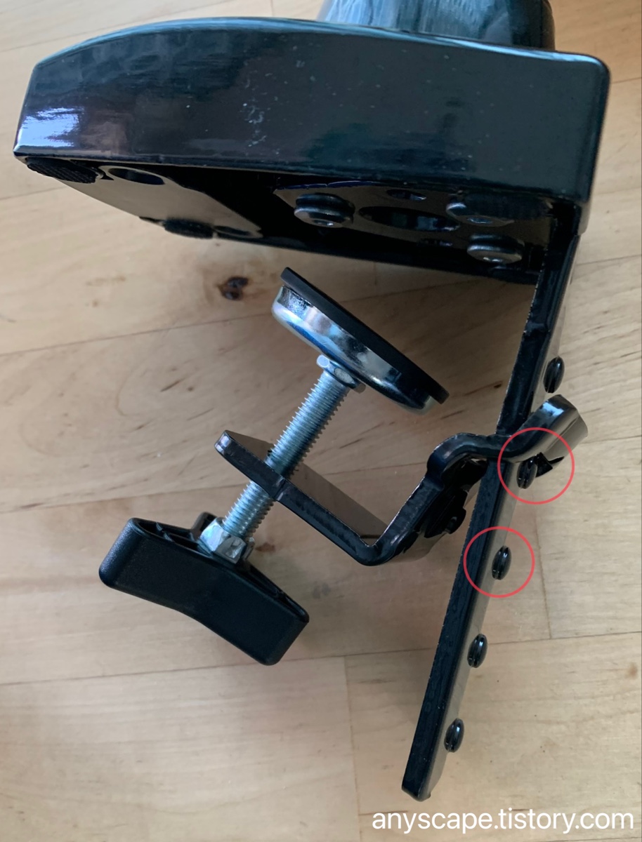 본격적인 조립에 들어갑니다. 먼저 이 클램프를 책상에 부착해야 합니다. 책상에 구멍을 파서 고정을 하는 방법도 있는데 설명서에 내용이 있고 해당 부품도 들어 있습니다. 책상 두께에 맞춰 저 빨간색 원 안의 부분에 걸어 조립하면 됩니다.