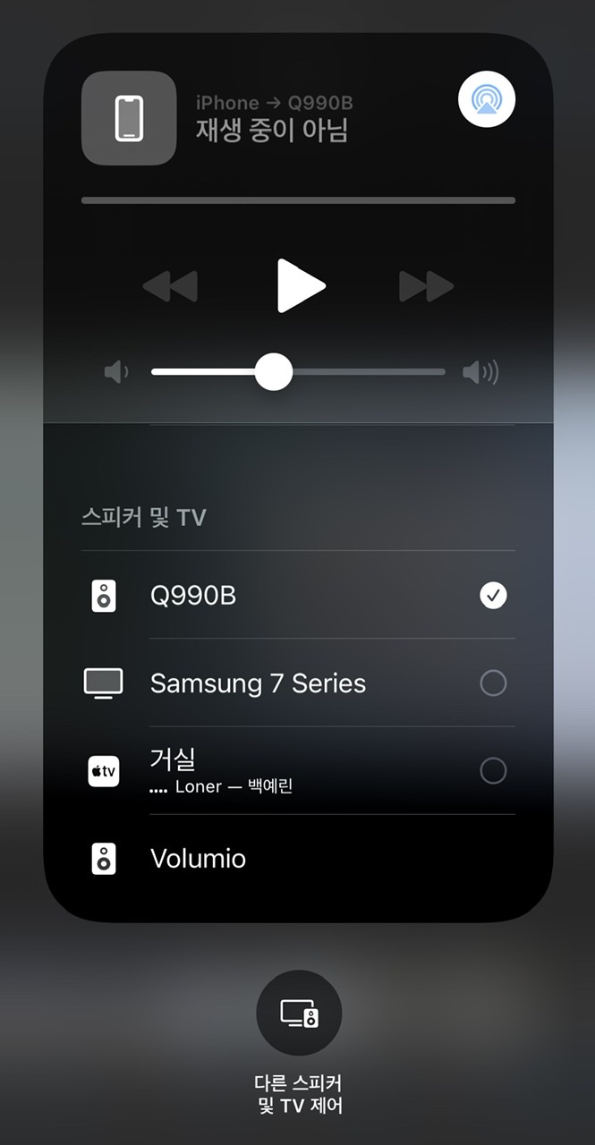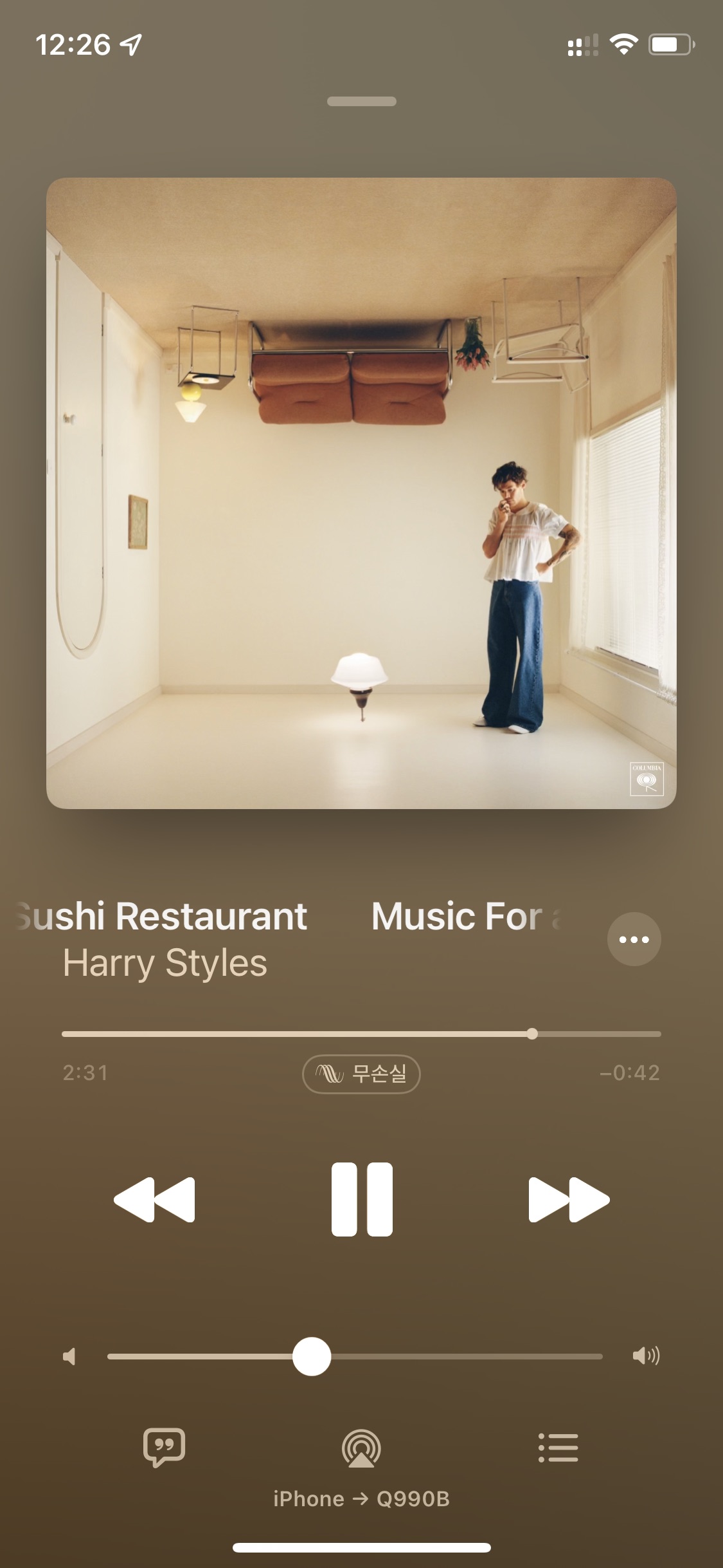 airplay2를 지원하기에 제가 구독하고 있는 애플뮤직으로 에어플레이로 음악을 들어봤습니다. 에어플레이 연결되면 사운드바에 WIFI라고 표시됩니다.