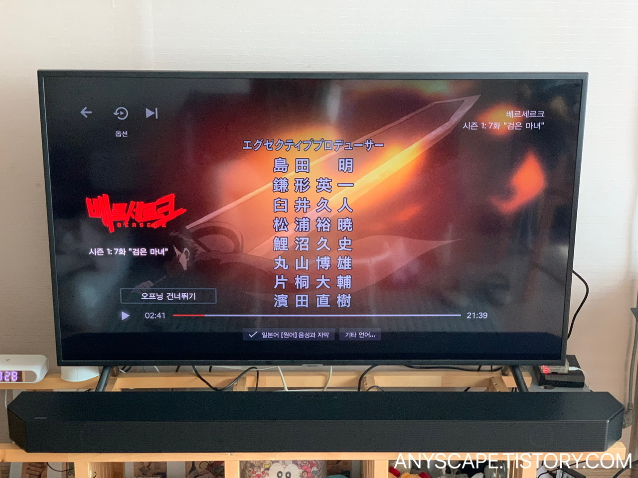 넷플릭스 안나라수마나라를 재생했습니다. 그런데 이것은... 녹음이 잘못 된건지, 아니면 사운드바와 뭔가 세팅이 안 맞는 건지 모르겠지만 시작 후 뮤지컬로 바뀌는 부분에서 도저히 들어줄 수 없는 소리가 나서 꺼버렸습니다. 귀를 찌르는 고음이 너무나 듣기 거북하더라고요.