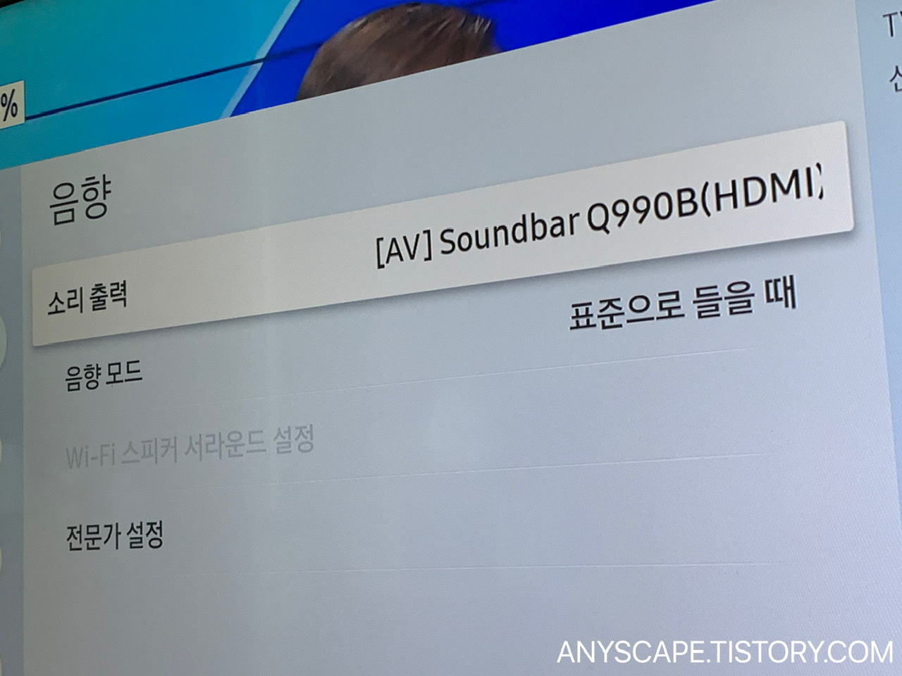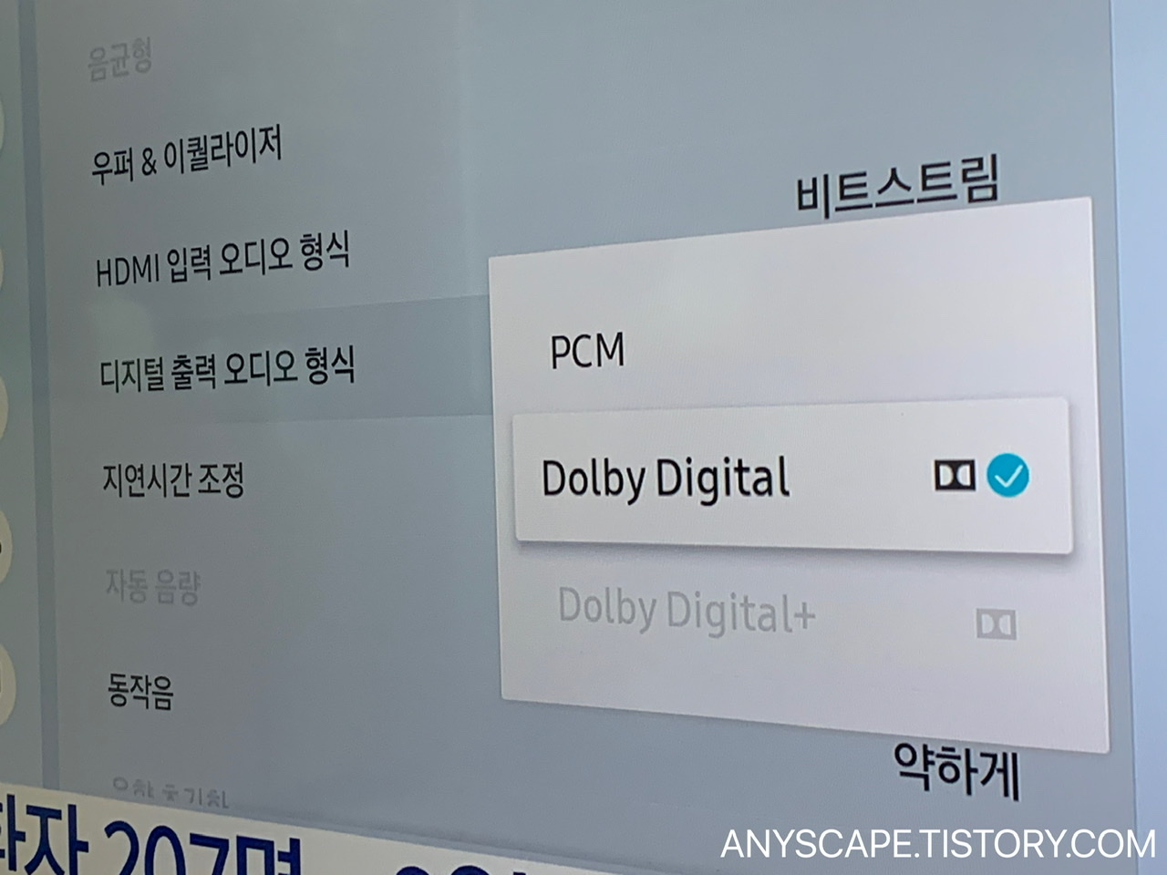 기쁜 마음에 설치를 후딱 끝내고 TV 음향설정에 들어가서 ‘돌비 디지털 플러스’로 세팅을 하려는데… 이게 선택이 안 됩니다.