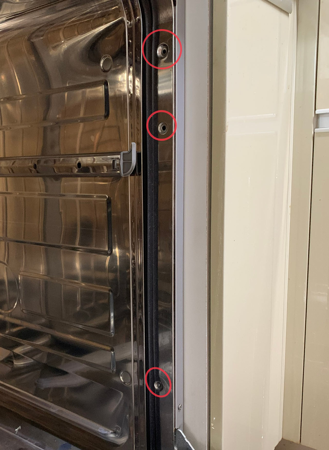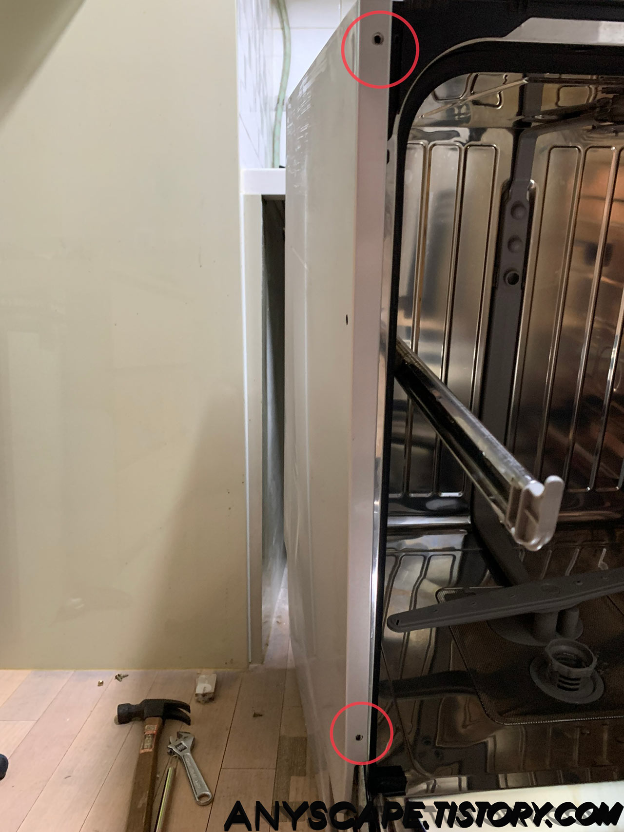 식기세척기 좌우측에 나사가 있습니다. 이중 하나는 싱크대에 고정시켜주는 나사입니다. 어떤게 싱크대와 고정되어 있는지 잘 안 보이기 때문에 전부 제거합니다.