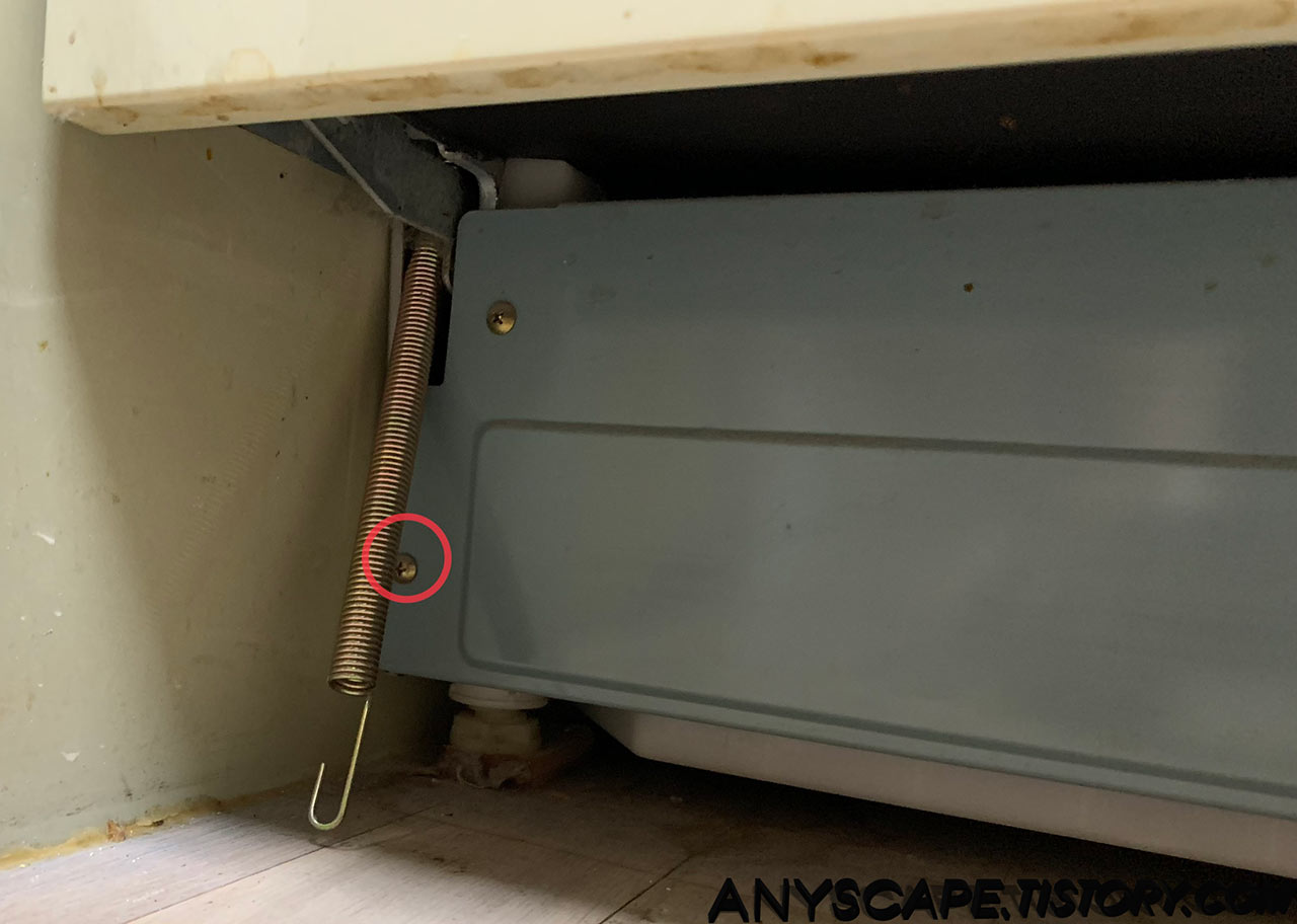 걸레받이를 제거하니 웬 스프링이 보이네요. 스프링이 빠져서 문이 고정 안 되는 것 같습니다. 아래 나사 하나만 미리 제거해주세요. 분해시에 필요합니다.