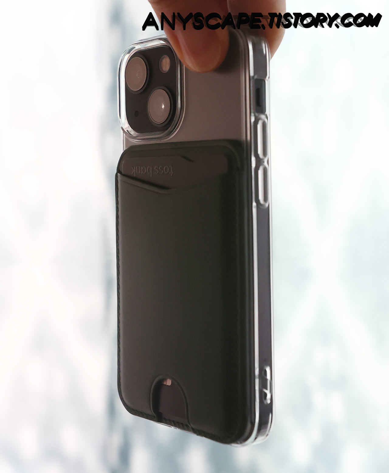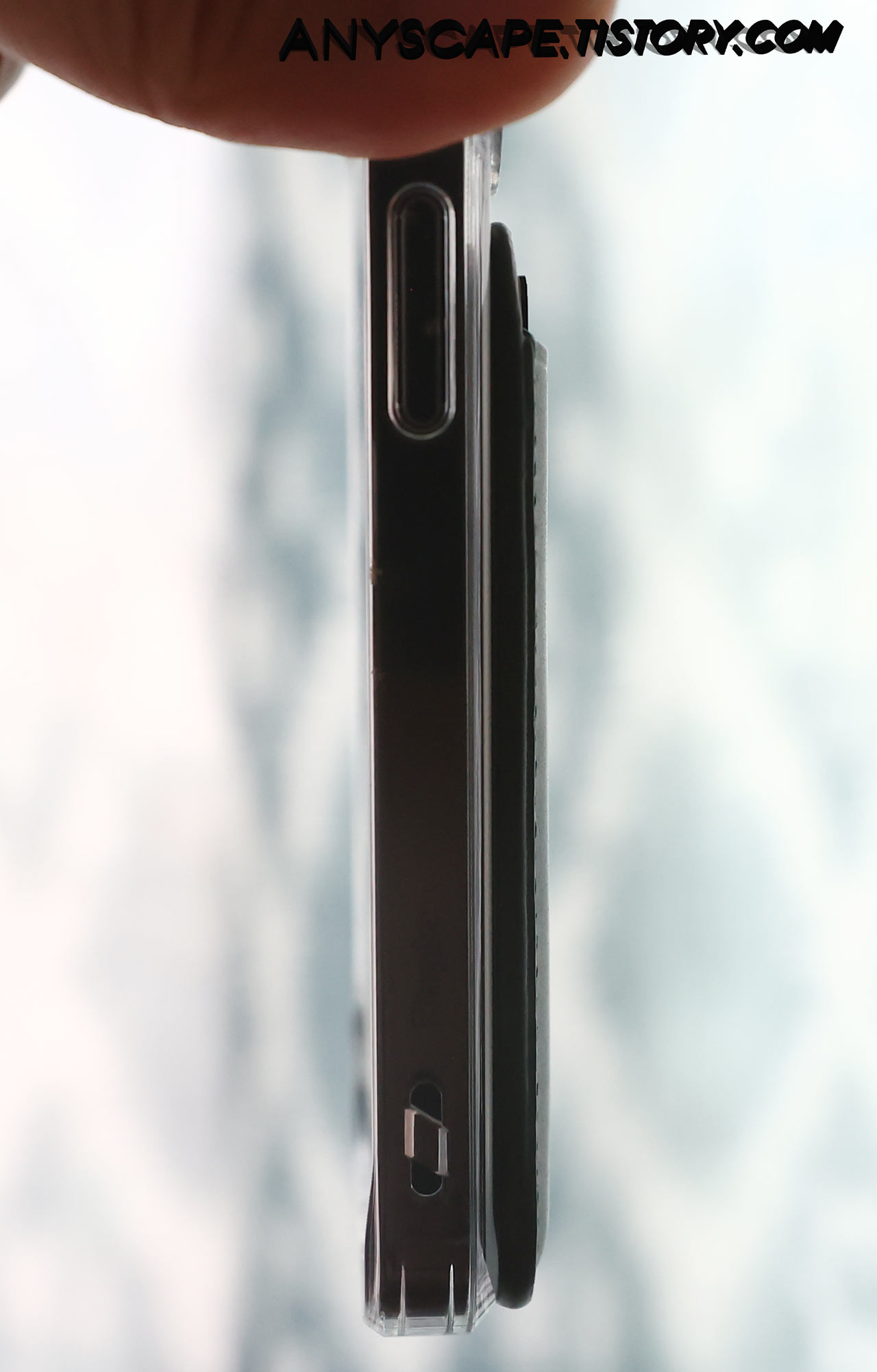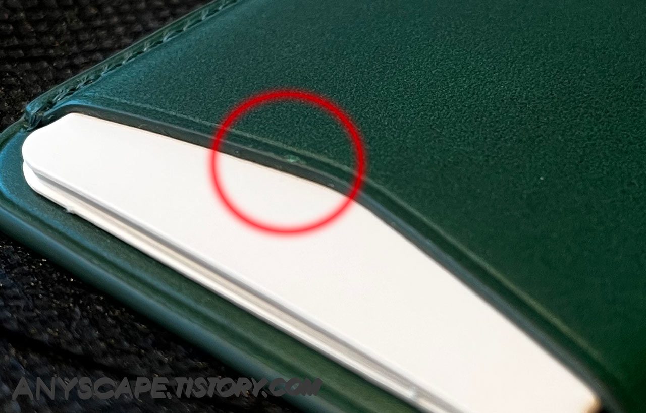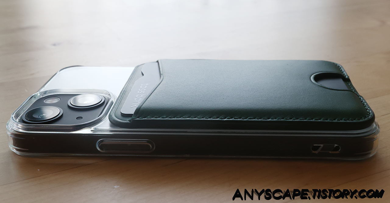 그래도 케이스가 얇아서 인지 지갑이 전혀 붙지 않는 것은 아니네요. 손으로 툭 치면 떨어지긴 하지만 일반 케이스에도 붙어있긴 합니다.