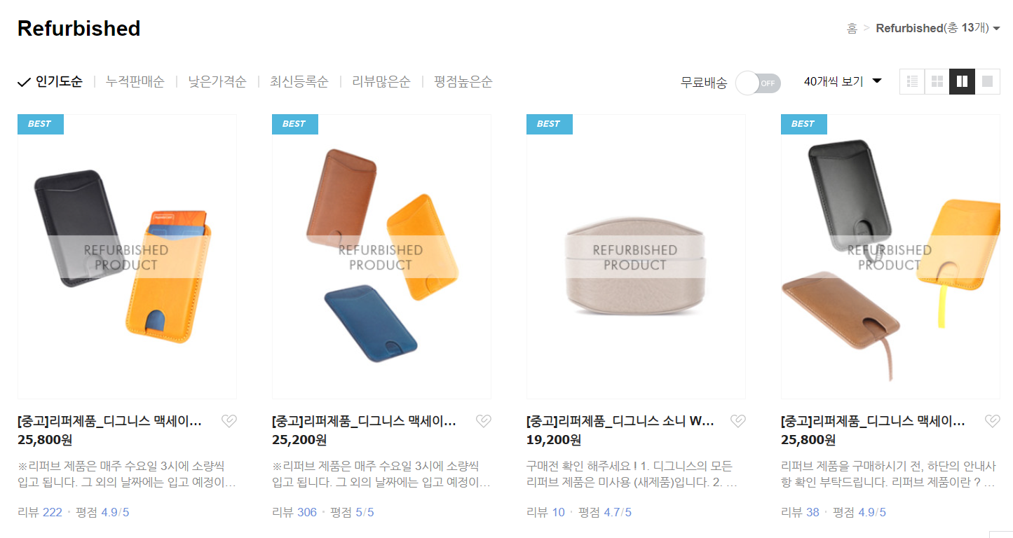 구입하려고 네이버 스마트스토어에 가서 이리저리 구경을 해보니 가죽이 아닌 재질은 좀 더 저렴하긴 했지만 가죽제품은 42,000원 정도였습니다. 애플 제품보다 많이 저렴했습니다. 그런데 리퍼 제품을 따로 팔더라고요.