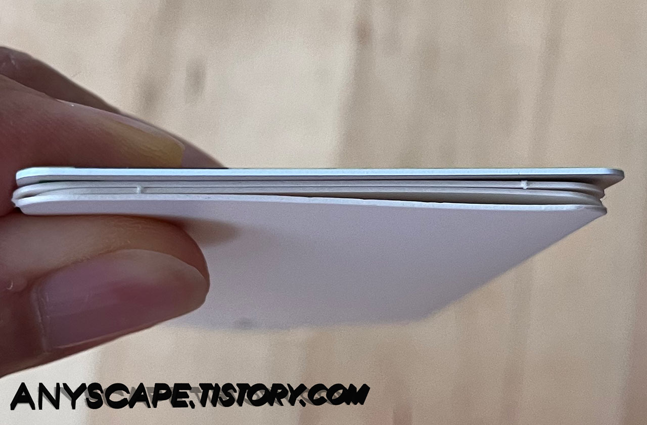설명서와 카드를 대어보니 설명서가 많이 두껍네요. 그래서 카드 1장 들어가는 제품임에도 카드 1장만 넣으니 좀 헐렁한 느낌이 들었습니다. 끝까지 밀어 넣으면 흔들어도 빠지지는 않지만 조금 불안한 느낌이 듭니다. 영 불안하면 카드에 실리콘 스티커를 덧대어 카드가 조금 두꺼워지게 하는 방법을 써도 될 것 같네요.