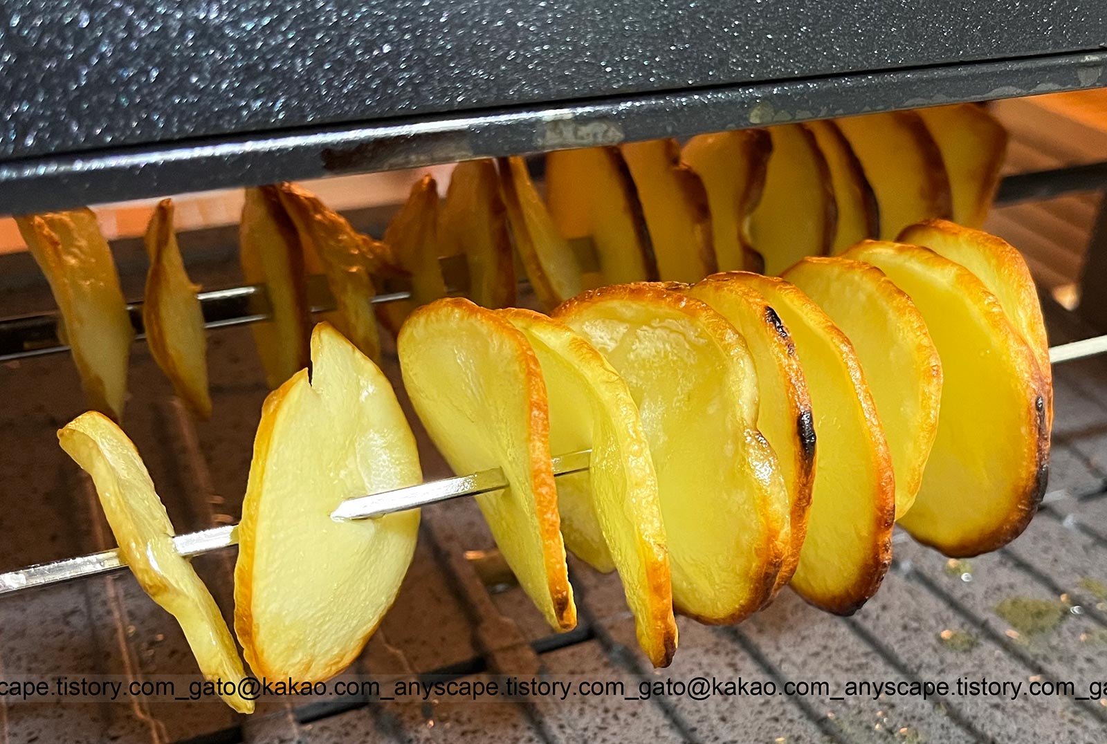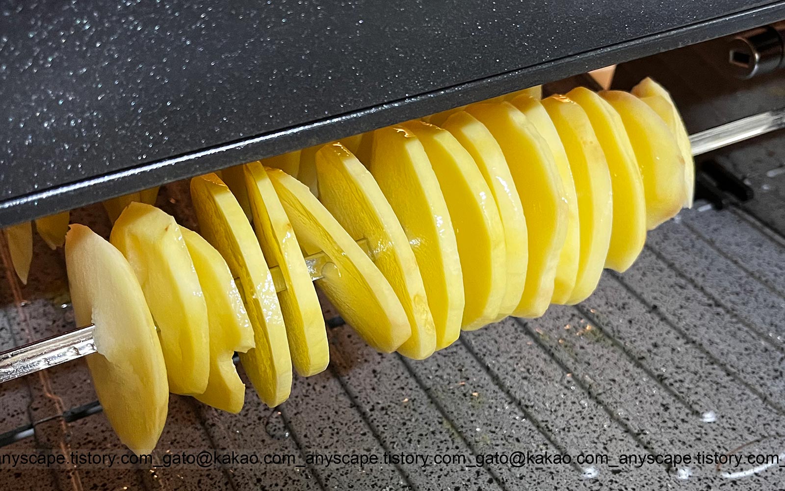 먼저 감자구이를 해봤습니다. 회오리 모양으로 자르려고 했는데 쉽지가 않더군요. 포기하고 채칼로 잘랐습니다. 소금물에 담가 뒀다가 기름 살짝 칠해서 돌려봤는데 맛은 있습니다. 그런데 효율이 매우 나쁘더군요. 쏟은 정성, 가스에 비해서 양도 적고 실망...