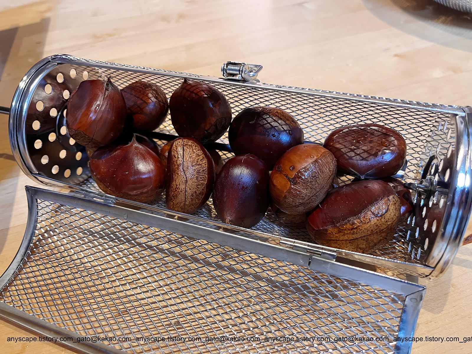 로스팅망으로 군밤 굽기에 도전합니다. 올해 신 버전에는 로스팅망이 옵션으로 빠졌습니다. 이전 사용기를 보면 포함돼있던 것 같은데... 별도로 구입했습니다. 군밤은 꽤 만족스럽습니다. 칼집 내는 게 제일 힘들었네요. 로스팅 망에 가득 담고 30~40분 구우니 적당합니다.