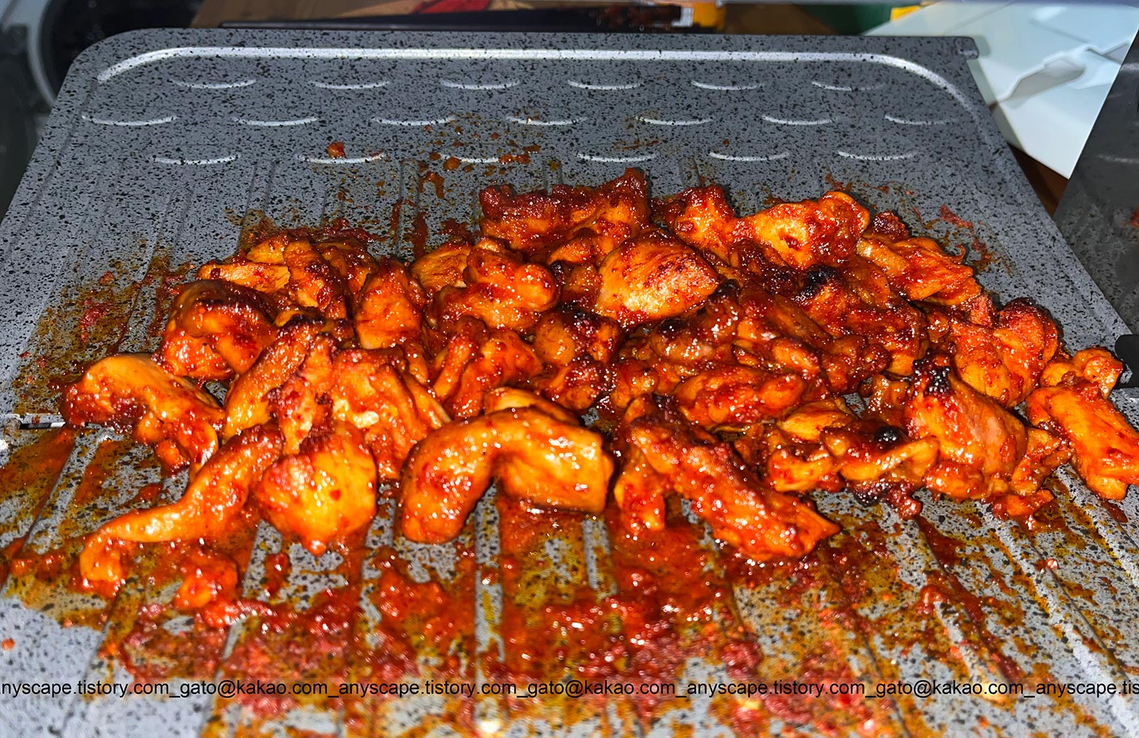 이건 냉동 닭갈비인데 이게 프라이팬에서 요리를 하면 물이 생겨서 질척해져 맛이 없더군요. 기름 빠지는 구멍이 있는 브라텐에서 구워봤습니다.