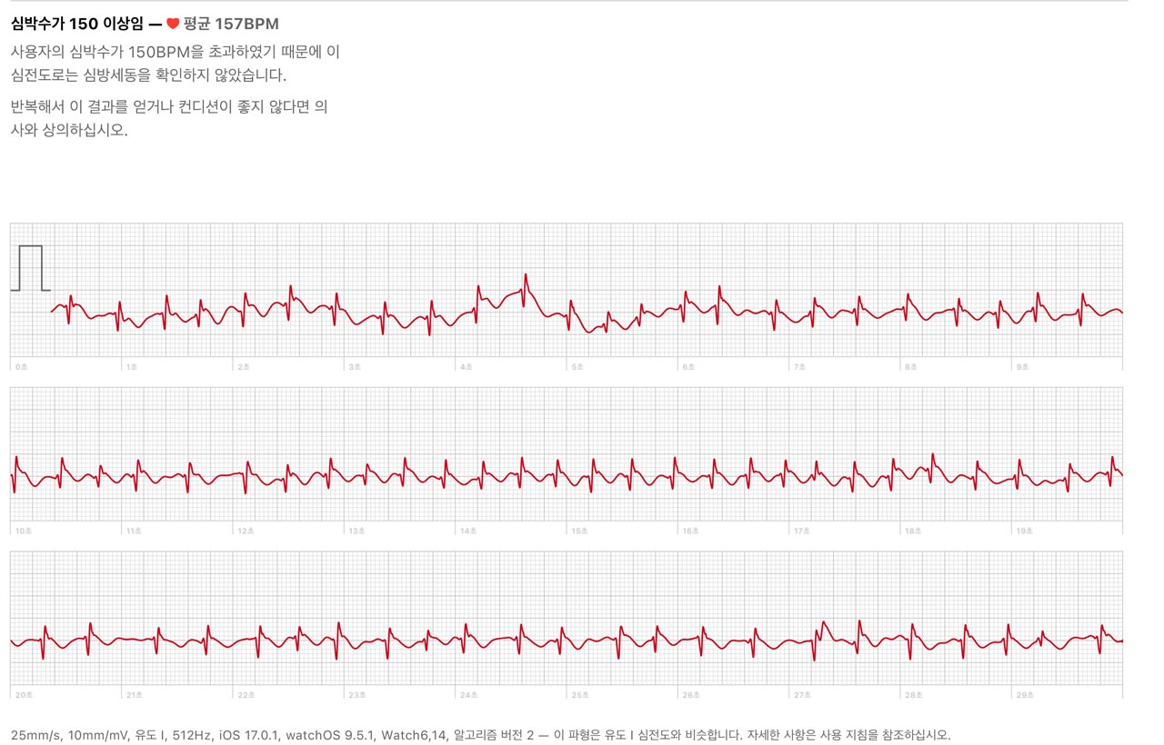 하지만 다행히 애플워치로 심전도 찍어 놓은 데이터가 있어 심한 날 찍은 차트 몇 개를 들고 갔습니다.