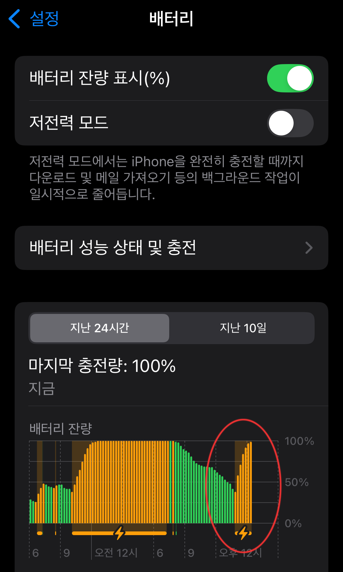 아이폰 설정>배터리에 표시된 실제로 툭키 보조배터리로 충전한 데이터입니다. 노란색으로 충전됐다고 표시되는데 이게 노란색은 '저속 충전'을 의미합니다. 15w 고속 충전이라며!! 라고 생각하실 분들을 위해 간단하게 설명하자면 맥세이프 무선 충전으로 충전하면 스펙에 있는 15w대로 충전이 안 됩니다. 발열 문제도 있고 무선으로 충전하기 때문에 중간에서 손실이 발생하기 때문입니다.