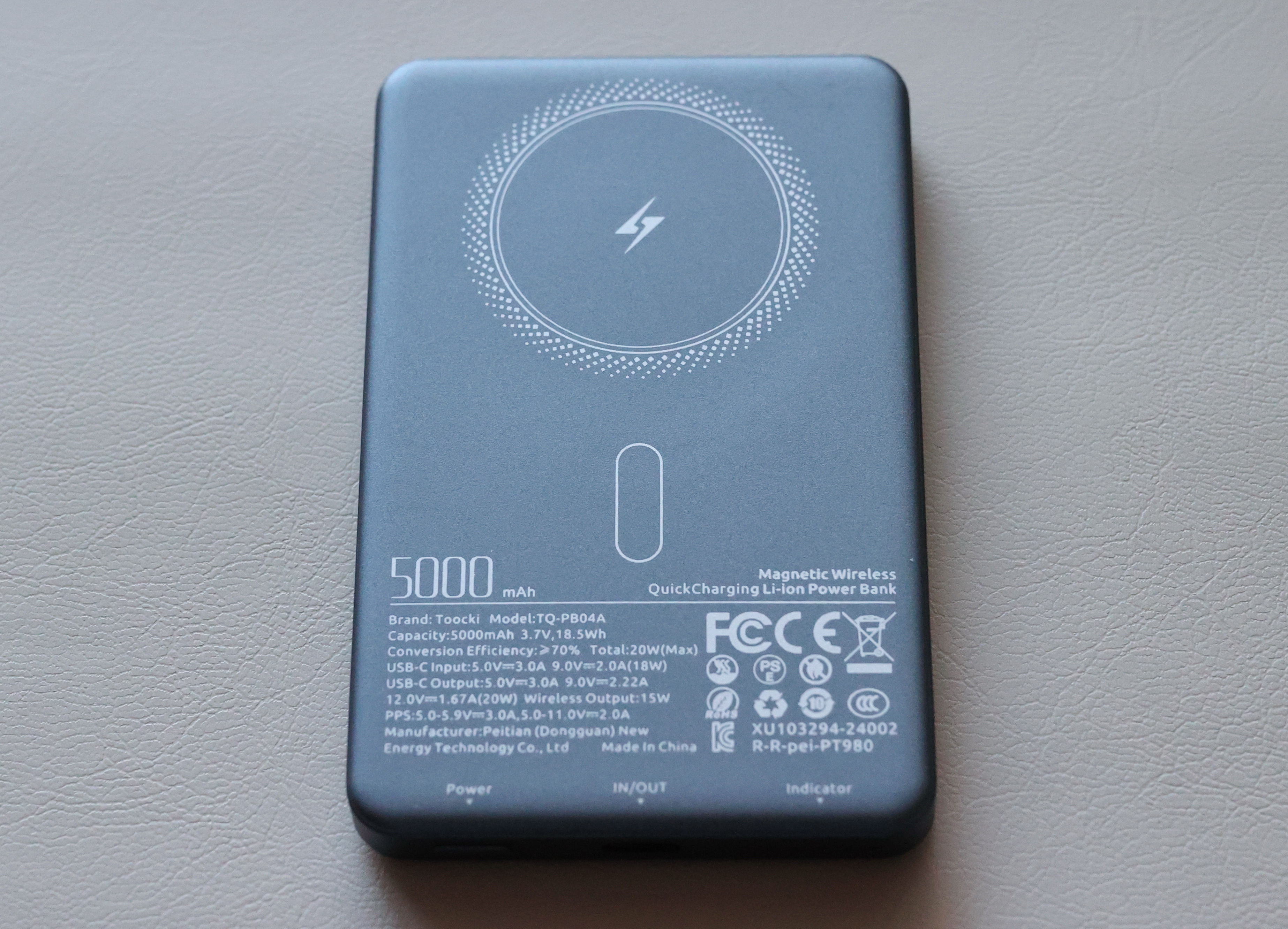 뒷면에 제품 스펙과 마그네틱 부착부가 있습니다. 오른쪽 하단에 한국에서 인증을 받은 KC마크가 보입니다. 스펙을 보면 USB-C 포트를 이용하면 최대 20W, 무선 충전은 최대 15W입니다.
