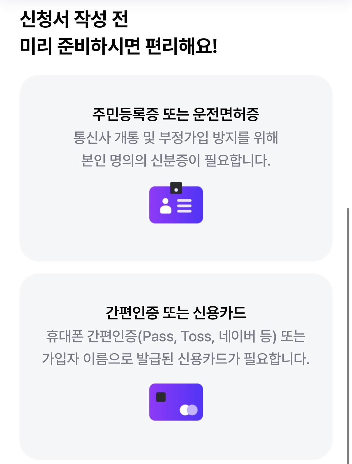 신분증과 간편인증, 신용카드가 필요합니다.