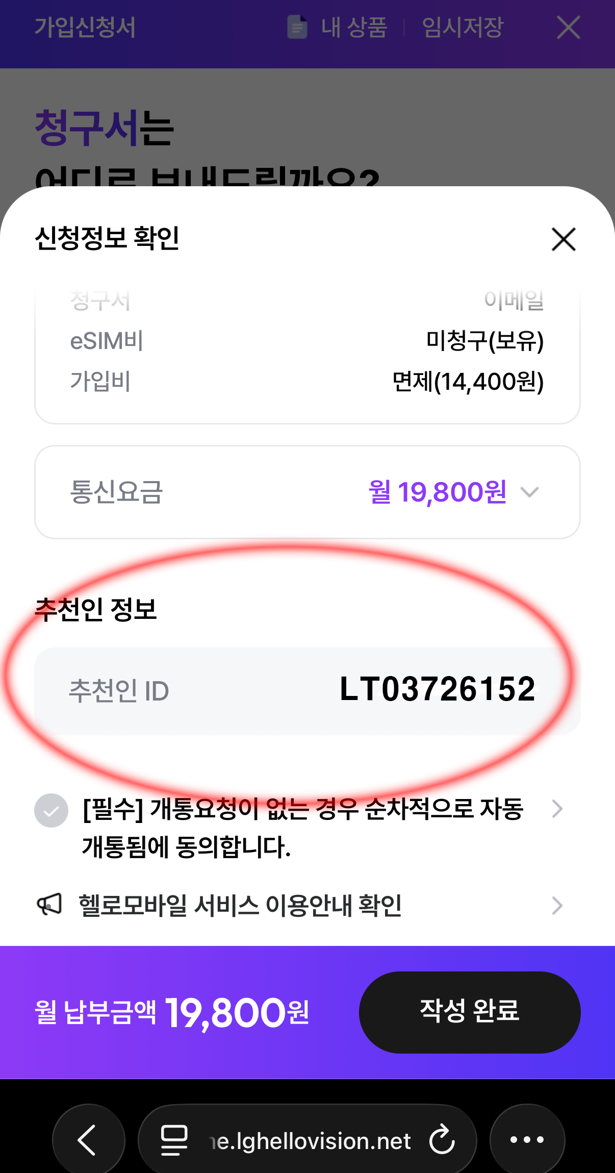 추천인ID는 영문자 LT 뒤 숫자8자리 포함 총 10개로 이뤄져 있습니다. 입력돼 있는지 확인하셔야합니다. LT03726152 모두 제대로 입력돼 있는지 확인하시고요,