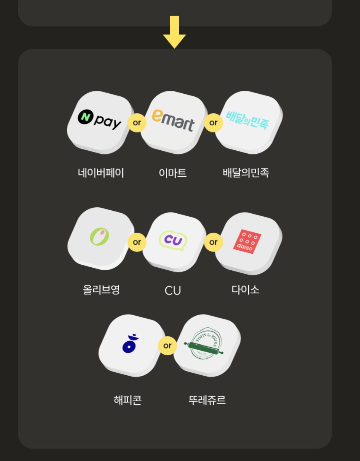 네이버페이, 이마트, 배민, 올리브영, CU, 다이소, 해피콘, 뚜레쥬르 중 매달 원하는 쿠폰 5천 원 권을 받을 수 있습니다.