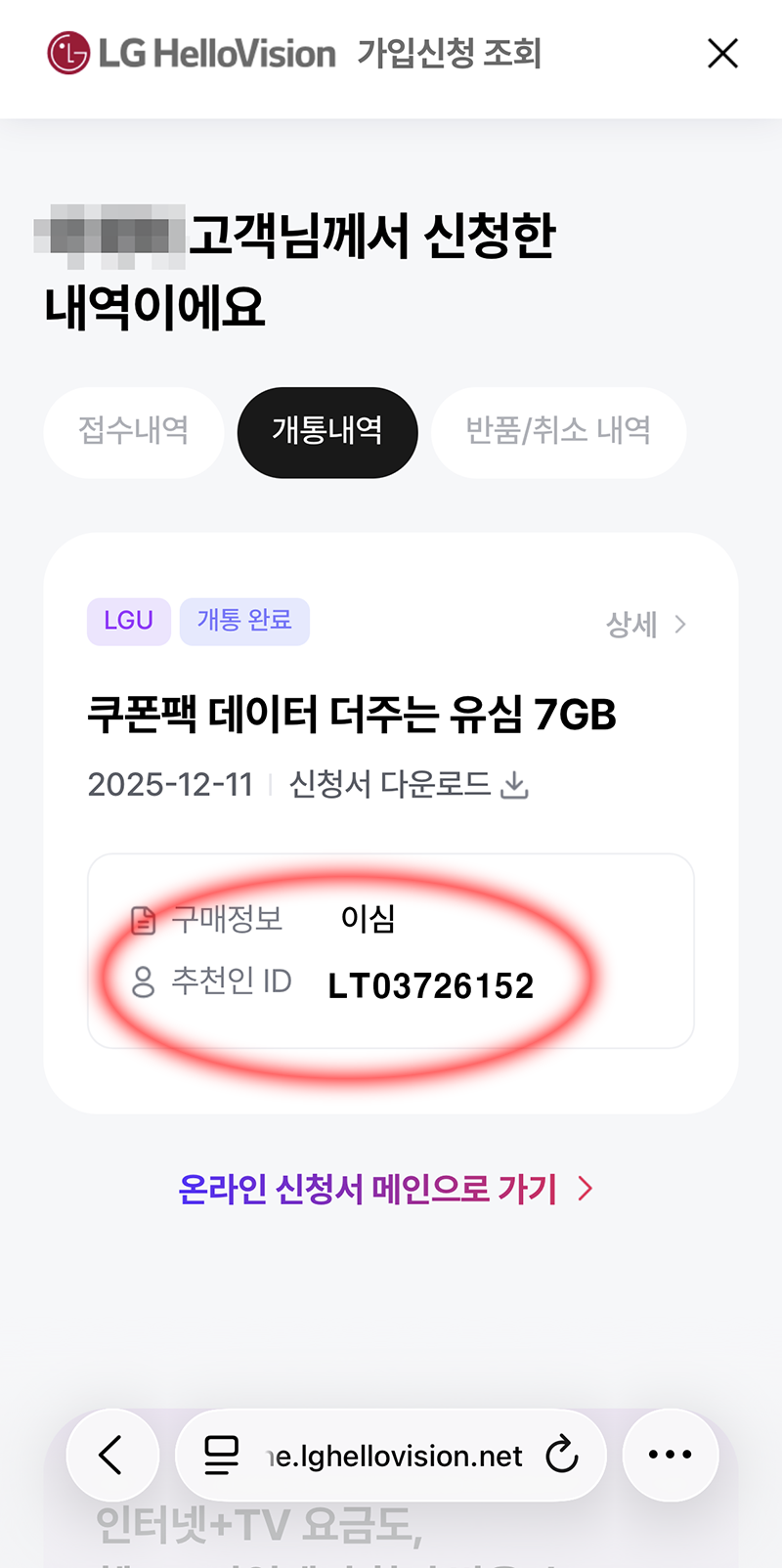 개통 후 개통 내역에 보면 추천인 ID가 제대로 입력된 게 보이실 겁니다.